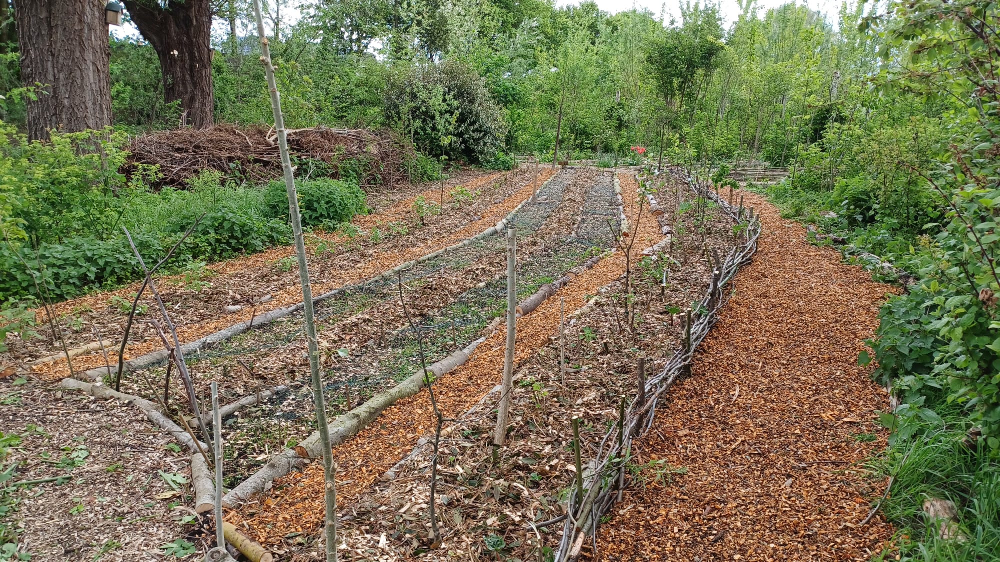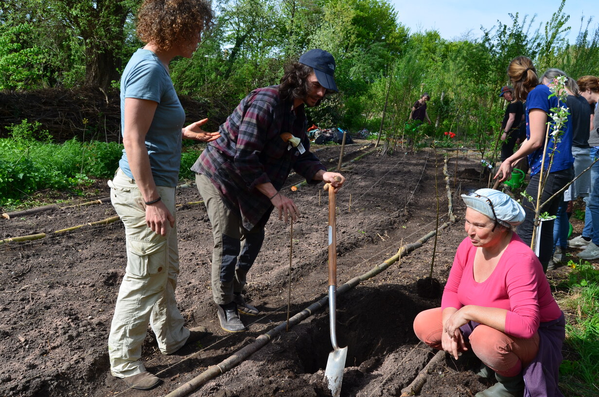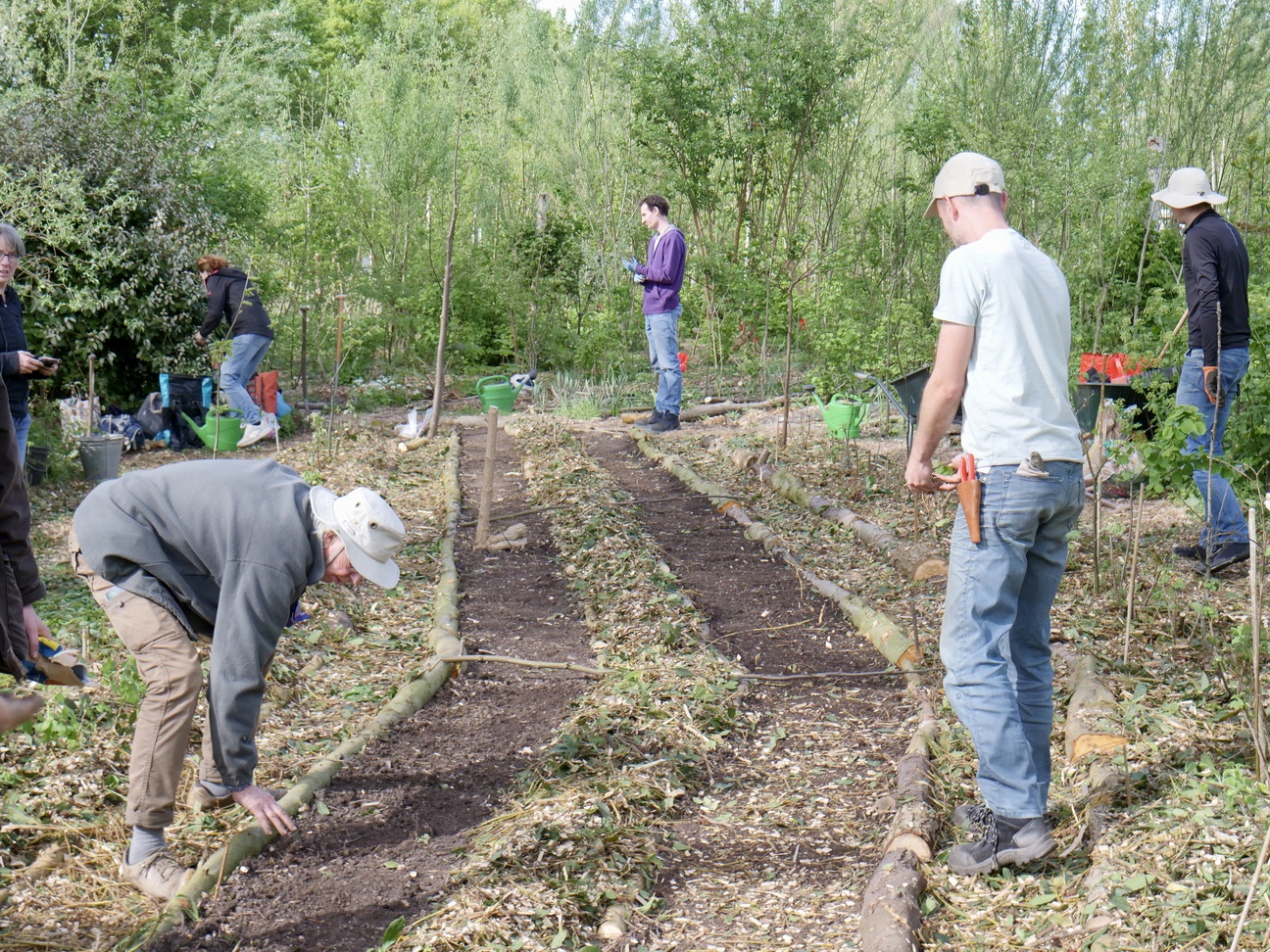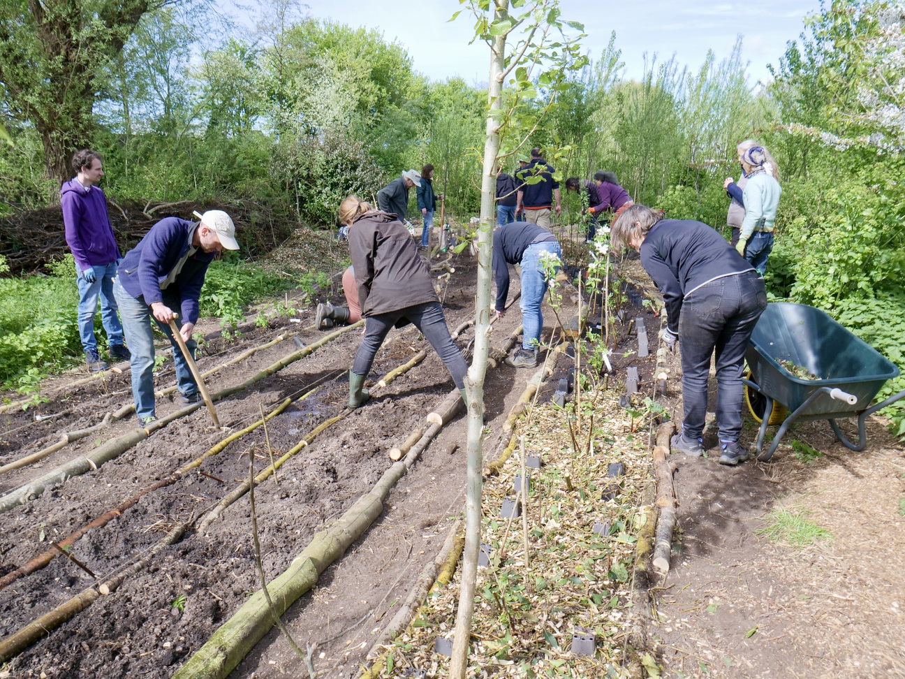 De plek werd vol gezaaid en geplant met soorten die elkaar (in hoge dichtheid) in tijd en ruimte gaan opvolgen. Vol? Nou zo vol: Kastanjes, eiken, populieren, wilgen, essen, vlieren, appels, linden, aalbessen, frambozen, asperges, aardperen, rabarber, smeerwortel, aardbeien, uien, aardappelen, doperwten, tuinbonen, japanse haver, phacelia en gele mosterd.